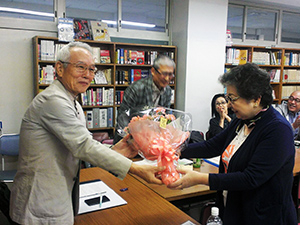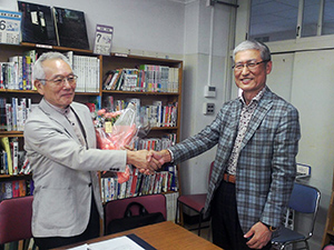 平成27年10月31日かに開催されました役員会において、同窓会会長の交代がありましたのでお知らせいたします。18年間ご尽力頂いた伏原会長には花束が贈られました。